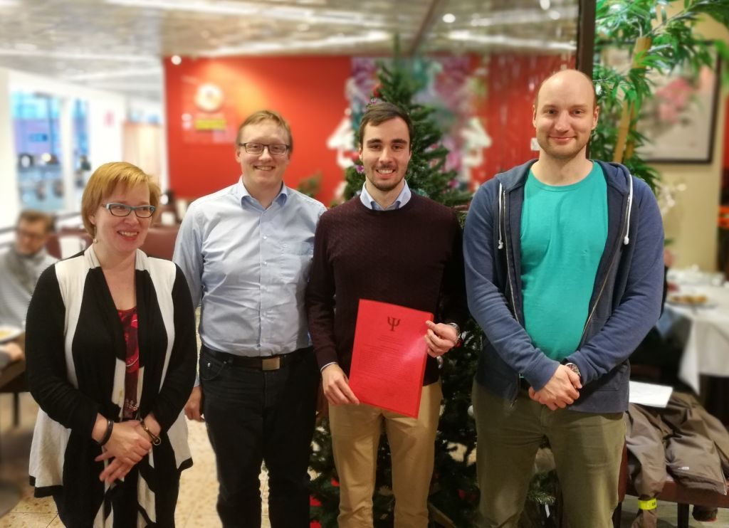 Palkinnonjakotilaisuus jaoston vuosikokouksessa 2018. Kuvassa vasemmalta Maria Sammalkorpi, Antti Karttunen, Rasmus Kronberg ja Susi Lehtola. Kuvaaja: Atte Sillanpää